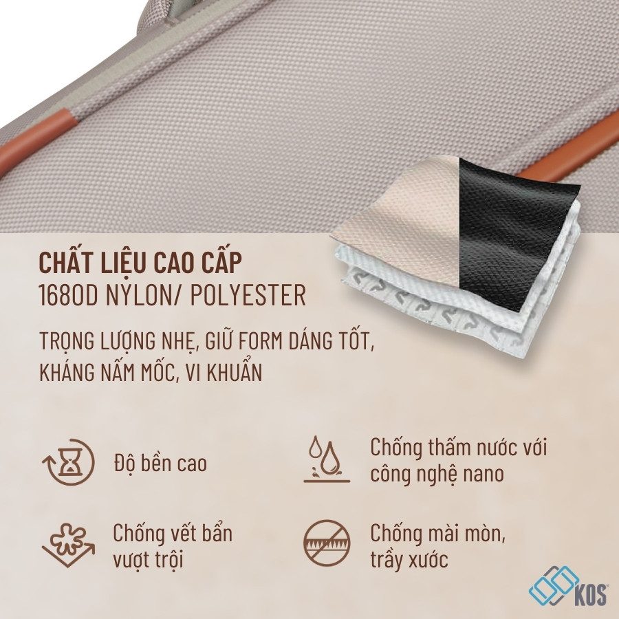 - Chất liệu cao cấp: vải nylon ballistic 1680D kết hợp polyester 210T, được xử lý bằng công nghệ nano giúp chống thấm nước, chống bám bẩn và chống mài mòn.
